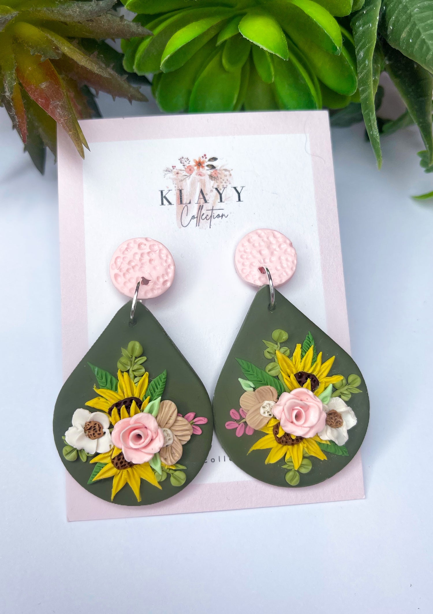 These stunning earrings are the definition of shabby chic! Gorgeous Olive greens and creams make the perfect combination! Beautifully designed windswept sunflowers with lots of detail and a gorgeous ombre rose to top it off! The perfect accompaniment to your favourite boho dress!