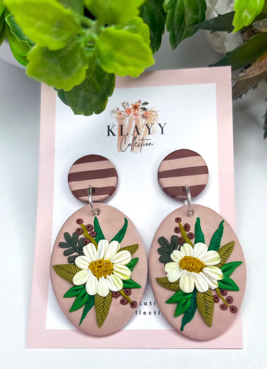 How stunning are these!!! Beautiful daisies surrounded by lush green foliage and with a beautiful contrast stripy stud! What a statement!!! Perfect for cooler months, with that gorgeous shrug or scarf!!!